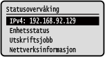 [Vis IP-adresse] [Feilinformasjon/-melding]Du kan sjekke feilinformasjonen som oppstår på maskinen. Iverksett feilsøkingstiltak i henhold til feildetaljene.