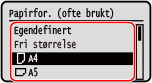 Du kan bla nedover på skjermbildet hvis du vil vise papirformater (som konvolutter) som ikke vises på skjermen.
