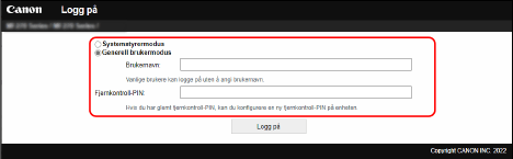 Når du skal bruke Fjernkontroll, angir du IP-adressen til maskinen i en nettleser på en datamaskin, og logger inn med systemstyrermodus eller modus for generelle brukere. Funksjonene som er tilgjengelig med Fjernkontroll varierer, avhengig av modusen du logger inn med.