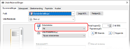 I [Sidestørrelse] på fanen [Grunninnstillinger] velger du papirformatet for dokumentet.
