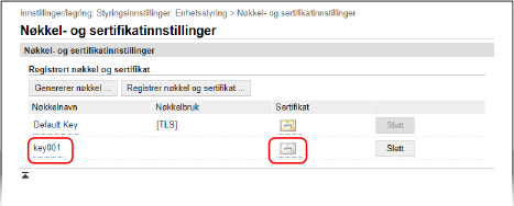 Vise og verifisere detaljert informasjon for et registrert sertifikatKlikk på nøkkelnavnet (eller sertifikatikonet) i [Registrert nøkkel og sertifikat] på skjermbildet [Nøkkel- og sertifikatinnstillinger] hvis du vil vise detaljene for sertifikatet. På skjermbildet for detaljer om sertifikatet, klikker du på [Kontroller sertifikat] hvis du vil sjekke om sertifikatet er gyldig. Når nøkkel og sertifikat ikke kan slettesDu kan ikke slette en nøkkel og sertifikat som er i bruk. Deaktiver funksjonen som brukes eller slett disse etter å ha byttet til en annen nøkkel og sertifikat. |
