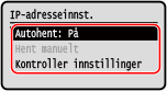 2 | Konfigurer innstillingen for automatisk innhenting etter behov. [Velg protokoll] Vanligvis stilt inn til [DHCP]. Når [DHCP] imidlertid er stilt inn i et miljø der DHCP ikke kan brukes, vil maskinen fortsette å bekrefte automatisk innhenting i nettverket, noe som fører til unødvendig kommunikasjon. Når du ikke bruker DHCP, stiller du denne inn til [Av]. [Auto-IP] Vanligvis stilt inn til [På]. Selv om prioritet gis til IP-adresser som er tildelt med DHCP, vil automatisk IP bli brukt hvis det ikke kommer respons fra DHCP. |