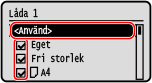 Skärmen med pappersinställningar visar registrerade pappersformat som ofta används. Om pappersformat som inte används visas kan du dölja dessa för att göra det enklare att välja ett pappersformat.