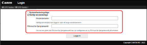 När en PIN-kod för åtkomst till fjärranvändargränssnittet är inställd anger du denna PIN-kod.