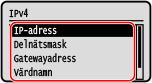 Starta fjärranvändargränssnittetNär du använder en IPv4-adress kan du skicka ett ping-kommando från kontrollpanelen på följande sätt för att kontrollera om enheten kan ansluta till en nätverksenhet.