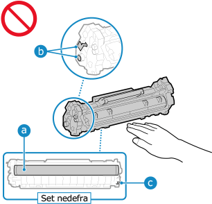 Sørg for at holde fast i tonerpatronen ved hjælp af håndtaget. Lav ikke ridser på tromlens overflade (  ) og udsæt den ikke for lys. Rør heller ikke ved de elektriske kontakter (  ) eller tonerpatronens hukommelse (  ). |