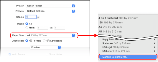 I [Papirstørrelse] under printerindstillingerne skal du vælge [Administrer specielle størrelser].