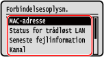 Ud over MAC-adressen og forbindelsesinformationerne for trådløst LAN, når maskinen er forbundet til det trådløse LAN, kan du også få vist sikkerhedsindstillingerne.