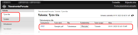 Voit poistaa tulostettavien tai odottavien töiden tulostustiedot napsauttamalla [Peruuta] kohdassa [Työtoiminto].