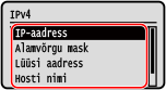 Remote UI (Kaugkasutajaliides) käivitamineKui kasutate IPv4-aadressi, saate järgmise protseduuri abil saata juhtpaneeli kaudu pingimiskäsu, et kontrollida, kas seade saab võrguseadmega ühendust.