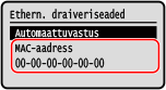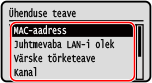 Seadme IP-aadress ja MAC-aadressi andmed on vajalikud rakenduse Remote UI (Kaugkasutajaliides) kasutamiseks ja tulemüüri sätete määramiseks. Kontrollige neid kehtivaid sätteid.