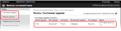 Если вход выполнен в режиме администратора, здесь отображается состояние печати для всех заданий.