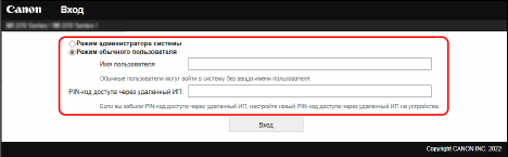Выберите [Режим администратора системы] или [Режим обычного пользователя] и введите данные, необходимые для входа.