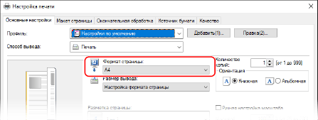 В списке [Формат страницы] на вкладке [Основные настройки] выберите формат бумаги документа.
