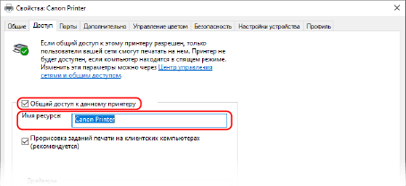 На вкладке [Доступ] установите флажок [Общий доступ к данному принтеру] и введите общее имя.