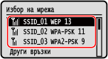 Потърсете безжичен LAN маршрутизатор (точка за достъп), към който да се свържете, и въведете мрежовия ключ. Когато се свързвате чрез метода за настройка с точка за достъп, се задават следните методи за удостоверяване и криптиране: Метод за WEP удостоверяване: Отворена система Криптиране за WPA/WPA2: AES-CCMP или TKIP се настройва автоматично в зависимост от избрания безжичен LAN маршрутизатор. За да посочите различен метод за удостоверяване или криптиране, използвайте метода за ръчна настройка, за да се свържете. Свързване към безжична LAN мрежа чрез задаване на подробни данни (метод за ръчна настройка) |