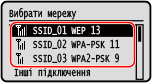 Знайдіть маршрутизатор безпроводової локальної мережі (точку доступу), до якого слід підключитися, і введіть ключ мережі. У разі підключення методом налаштування точки доступу встановлюються такі методи автентифікації та шифрування: метод автентифікації WEP: Open System; шифрування для WPA/WPA2: автоматично встановлюється протокол AES-CCMP або TKIP з урахуванням вибраного маршрутизатора безпроводової локальної мережі. Щоб указати інший метод автентифікації чи шифрування, підключіться за допомогою методу налаштування вручну. Підключення до безпроводової локальної мережі за допомогою налаштування даних (метод налаштування вручну) |