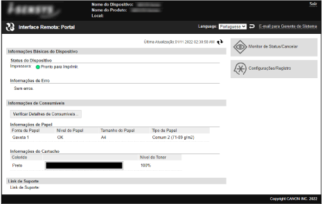 Quando inicia sessão na IU remota, aparece a página do portal (página superior da IU remota). Aqui, pode verificar o estado de funcionamento da máquina, visualizar várias informações e alterar as definições com o botão de operações.