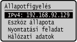 lehetőséget. Ezen a képernyőn ellenőrizheti a készülékkel, a használattal és a naplókkal, a hálózati beállításokkal és a hibákkal kapcsolatos információkat. [Állapotfigyelés] képernyő