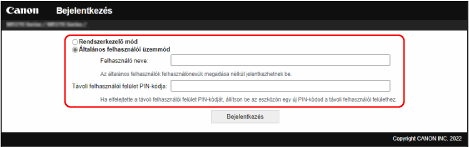 Válassza ki a [Rendszerkezelő mód] vagy [Általános felhasználói üzemmód] elemet, majd adja meg a bejelentkezéshez szükséges elemeket.