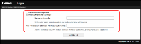 Aby skorzystać ze zdalnego interfejsu użytkownika, wprowadź adres IP urządzenia w przeglądarce internetowej na komputerze i zaloguj się w trybie menedżera systemu lub w trybie ogólnego użytkownika. Funkcje dostępne za pomocą zdalnego interfejsu użytkownika różnią się w zależności od trybu, w którym się zalogowałeś.