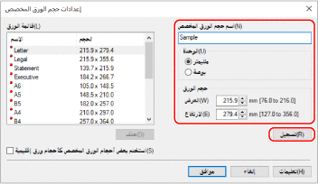 أدخل اسم الورق بالحجم المخصص وحجم الورق، ثم انقر فوق [تسجيل].