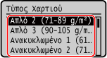 Αν αλλάζετε συχνά το χαρτί που τοποθετείτε, ορίστε την επιλογή [Ελεύθερο]. Αυτό θα μειώσει τον αριθμό των βημάτων που απαιτούνται για να αλλάζετε κάθε φορά τη ρύθμιση. Ωστόσο, έχετε υπόψη ότι αυτή η ρύθμιση επιτρέπει στη συσκευή να εκτυπώνει ακόμα και αν υπάρχει ασυμφωνία μεταξύ της ρύθμισης για τον τύπο χαρτιού στο πρόγραμμα οδήγησης του εκτυπωτή και του τύπου του χαρτιού που έχει τοποθετηθεί πράγματι στη συσκευή.