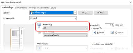 ใน [ขนาดกระดาษ] ของตัวเลือกการพิมพ์ ให้เลือกขนาดกระดาษของเอกสาร