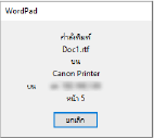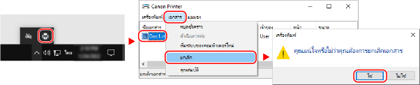 หากหน้าจอข้างต้นไม่แสดงขึ้นมา ให้ดับเบิลคลิกที่ไอคอนเครื่องพิมพ์ในพื้นที่แจ้งให้ทราบของ Windows แล้วเลือกเอกสารที่จะยกเลิก แล้วคลิก [เอกสาร]