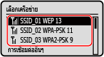 ค้นหาเราเตอร์ LAN แบบไร้สาย (จุดเข้าใช้งาน) ที่จะเชื่อมต่อ และใส่คีย์เครือข่าย เมื่อคุณเชื่อมต่อด้วยวิธีการตั้งค่าจุดเข้าใช้งาน วิธีการตั้งค่าการรับรองความถูกต้องและการเข้ารหัสจะถูกตั้งค่าดังนี้: วิธีการรับรองความถูกต้อง WEP: ระบบเปิด การเข้ารหัสสำหรับ WPA/WPA2: AES-CCMP หรือ TKIP ถูกตั้งค่าโดยอัตโนมัติตามเราเตอร์ LAN แบบไร้สายที่เลือกไว้ หากต้องการระบุวิธีการรับรองความถูกต้องหรือวิธีการเข้ารหัสอื่น ให้ใช้วิธีการตั้งค่าด้วยตนเองเพื่อเชื่อมต่อ การเชื่อมต่อกับ LAN แบบไร้สายโดยการตั้งค่ารายละเอียด (วิธีการตั้งค่าด้วยตนเอง) |