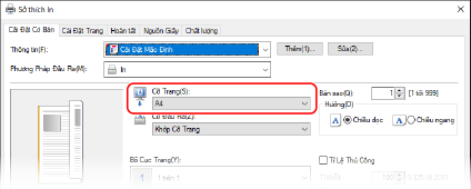 Trong [Cỡ Trang] trên thẻ [Cài Đặt Cơ Bản], chọn khổ giấy của tài liệu.