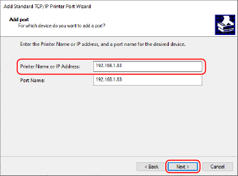 3 | Masukkan alamat IP atau nama DNS (nama hos), dan kemudian klik [Next]. Nama port dimasukkan secara automatik, jadi tukarkannya, sebagaimana yang diperlukan. Apabila [Additional port information required] Muncul Ikut arahan pada skrin. Untuk menetapkan [Device Type], pilih [Canon Network Printing Device with P9100] dalam [Standard]. |