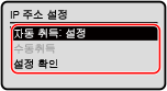 5 | [수동취득]을 선택하고 를 누릅니다.IP 주소 입력 화면이 표시됩니다. |