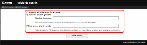 Para usar la IU remota, introduzca la dirección IP del equipo en un navegador web en un ordenador e inicie sesión con el modo de administrador del sistema o el modo de usuario general. Las funciones disponibles con la IU remota varían en función del modo en el que haya iniciado sesión.