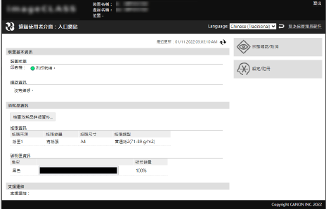 您登入到遠端使用者介面時,入口網站頁面(遠端使用者介面首頁)會出現。您可以從其中檢查本機的操作狀態、檢視各種資訊,以及藉由按鈕操作變更設定。