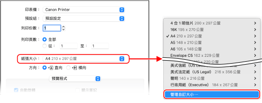 在列印選項的 [紙張大小] 中,選擇 [管理自訂大小]。
