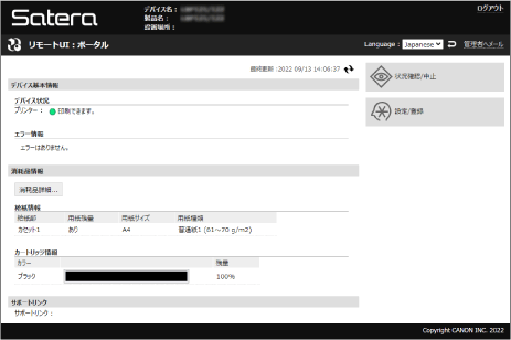 リモートUIにログインすると、ポータル画面(リモートUIのトップページ)が表示されます。本機の稼働状態や各種情報を確認したり、ボタンをクリックして設定を変更したりできます。