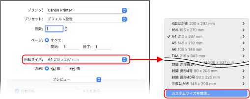 プリントオプションの[用紙サイズ]で、[カスタムサイズを管理]を選択する