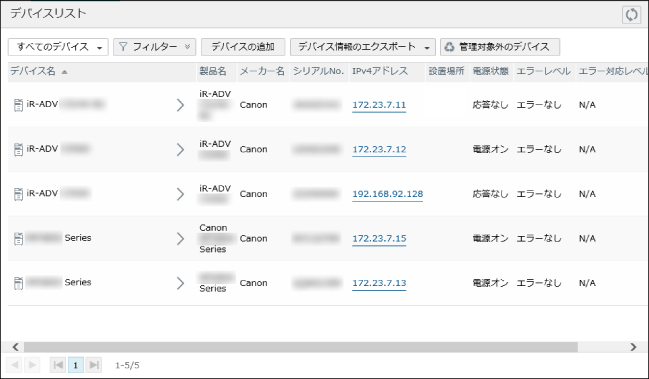 [電源状態] [エラーレベル] [エラー対応レベル] | いずれかをクリックすると、[ステータスの詳細]ページで、デバイスの状態についての詳細情報と、エラーの履歴を確認できます。詳細は、以下を参照してください。 [電源状態]:[不明] デバイスからステータス情報を取得できなかった場合に表示されます。 [電源状態]:[コンフリクト] 本ソフトウェアに登録されているデバイスのMACアドレスとIPアドレスの組み合わせが、デバイスから取得した情報と異なる場合に表示されます。実際のデバイス情報を本ソフトウェアに反映させるには、デバイスを探索しなおします。詳細は、以下を参照してください。 [エラーレベル]、[エラー対応レベル] 複数のエラーが発生している場合は、最も重要度が高いエラーの情報を表示します。 詳細は、以下を参照してください。 |