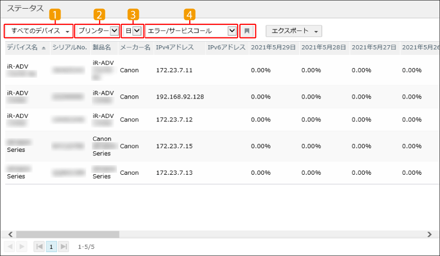 | 集計するステータスを、[警告/エラー/サービスコール]、[エラー/サービスコール]、[サービスコール]から選択します。 |