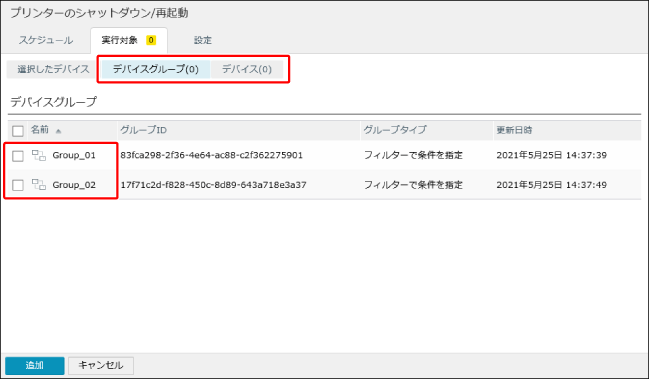 [デバイスグループ]または[デバイス]をクリックしたあと、実行対象とするデバイスグループまたはデバイスにチェックマークを付けます。