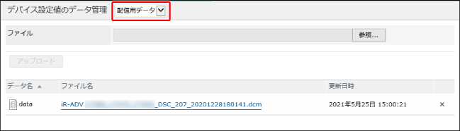 [デバイス設定値のデータ管理]ページの上部にあるドロップダウンリストから、[配信用データ]を選択します。