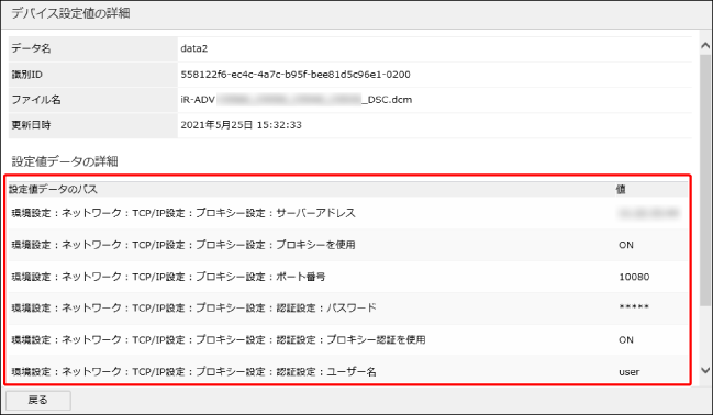 [データ名]をクリックすると、[デバイス設定値の詳細]ページでデータの内容を確認することができます。