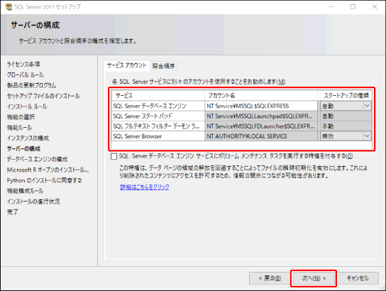 [サーバーの構成]画面の[サービス アカウント]タブで、以下の表示になっていることを確認したあと、[次へ]をクリックします。