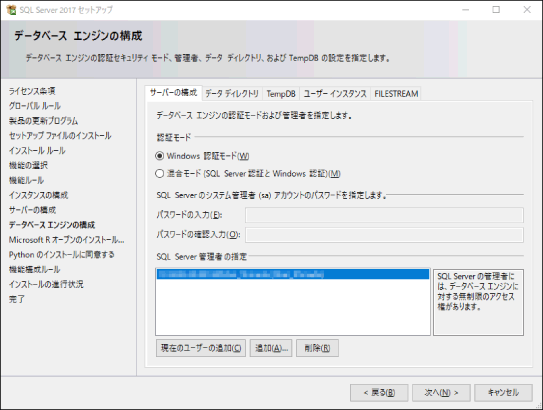 [データベースエンジンの構成]画面の[サーバーの構成]タブで、認証モードとSQL Server管理者の設定をします。