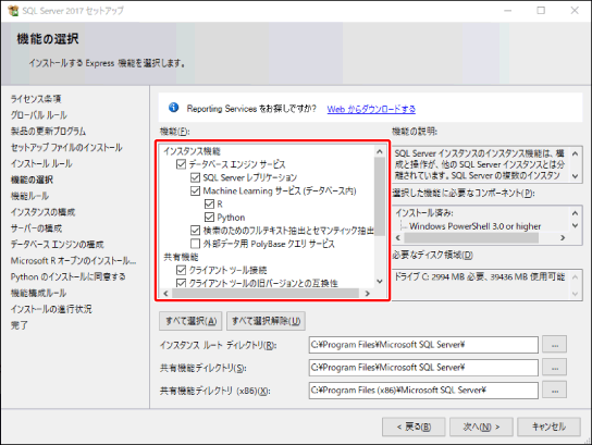 [Machine Learning サービス(データベース内)]とその下位の機能は、本ソフトウェアの動作には必要ありません。インストールしない場合は、チェックマークを外します。