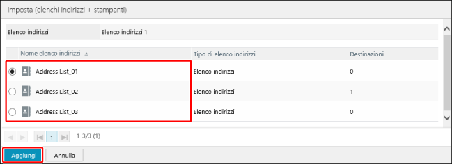 [Destinazioni] | Mostra il numero di destinazioni registrate nelle selezioni veloci e negli elenchi indirizzi visualizzati in [Elenco indirizzi per la distribuzione]. |