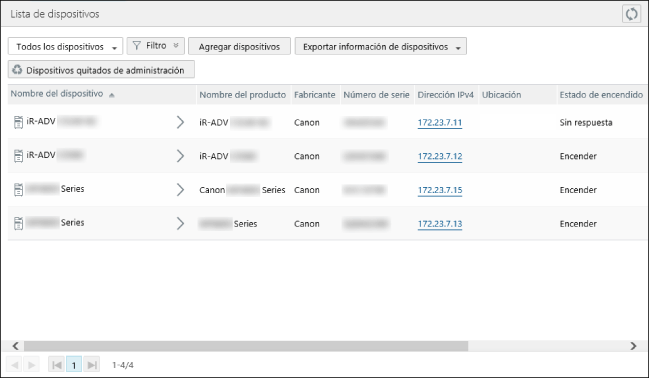 [Nombre del dispositivo] | Haga clic en el nombre del dispositivo para mostrar la página [Detalles del dispositivo] y consultar o editar la información detallada del dispositivo. También puede quitar dispositivos de la administración. Para obtener más detalles, consulte lo siguiente. |