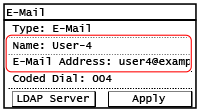5 | Press [Start Search]. The users who meet the search conditions are displayed. When the authentication screen is displayed, enter the user name and password of the machine that is registered to the LDAP server, and press [Apply]. |