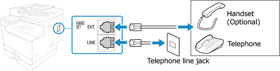 Connect an optional handset or a telephone to the handset jack (HAND SET)/external telephone jack (EXT.) on the machine.